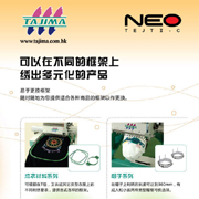 如田岛大型机器设备一样,可在帽子,高尔夫球衫,夹克,婴儿帽,手袋,围裙等物件上缝绣多达15种颜色。加上NEO配上田岛革命性设计的圆筒框,对裤脚口,口袋,袜子等这些较难缝绣的位置也都轻易解决。